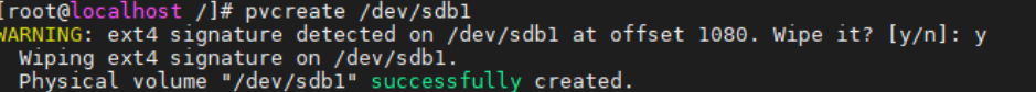 - 使用【pvcreate /dev/sdb1】创建物理卷(有可能有ext4签名是否擦除的提示,直接输入y会自动清除,重新格式化为xfs。注意若原存储上的文件有用,一定要先备份再处理)