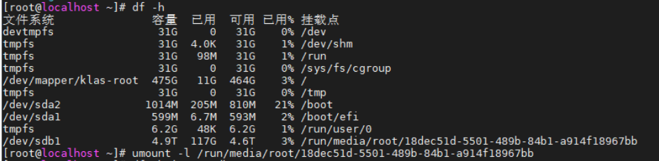 - 使用【umount -l /run/media/root/18dec51d-5501-489b-84b1-a914f18967bb】强制卸载挂载(存储未绑定时可忽略。如果存储之前有文件建议提前备份)