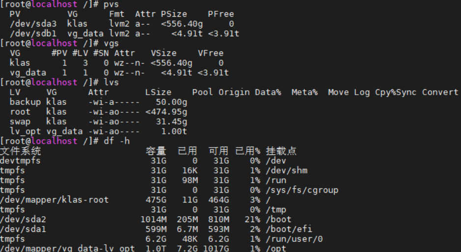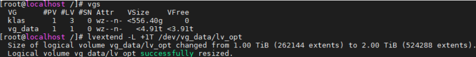 - 使用【lvextend -L +1T /dev/vg_data/lv_opt】给lv_opt的逻辑卷追加1T的容量(或【lvextend -l +100%FREE /dev/vg_data/lv_opt】分配全部),可以先用【vgs或vgdisplay】查看对应卷组的VFree剩余多少可分配空间