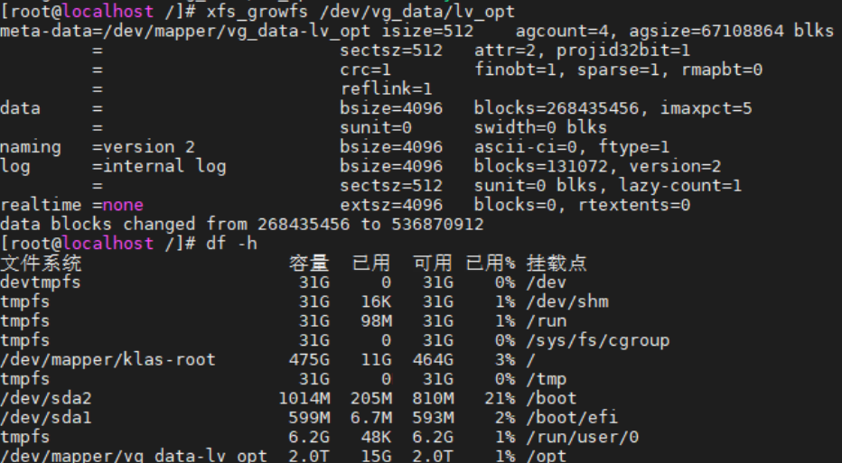 - 使用【xfs_growfs /dev/vg_data/lv_opt】让操作系统识别并使用新增的空间