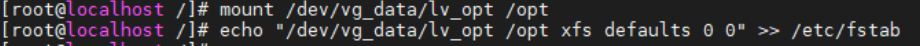 - 使用【echo "/dev/vg_data/lv_opt /opt xfs defaults 0 0" >> /etc/fstab】设置开机自动挂载