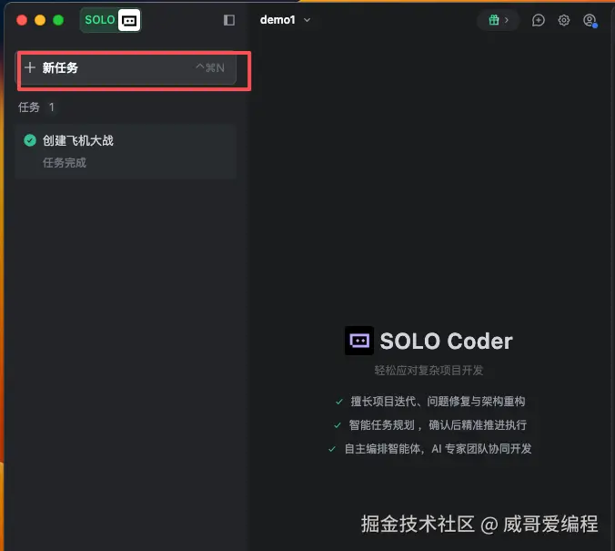首先打开 TRAE AI 开发工具,新建一个任务,如下图: