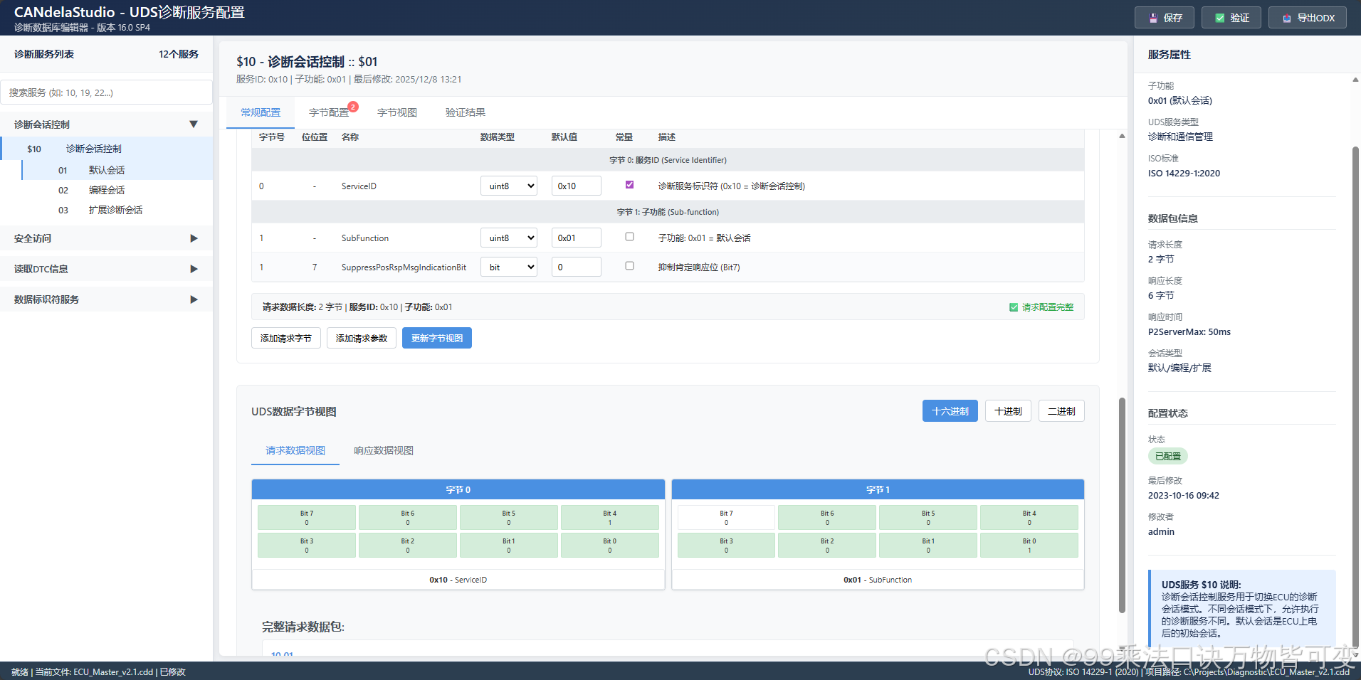 - 展示 UDS 服务(如 $10 诊断会话控制)的结构化配置;