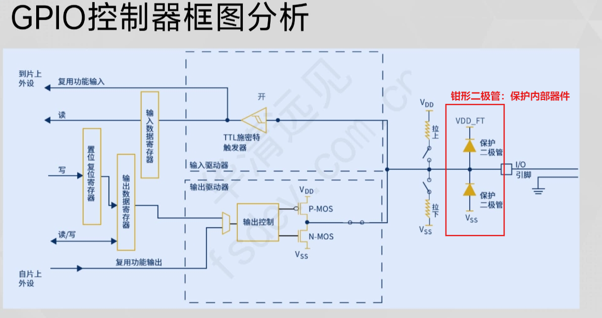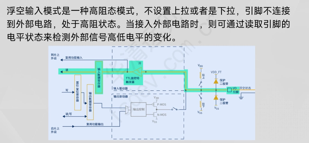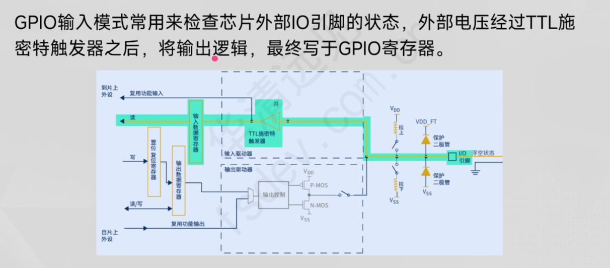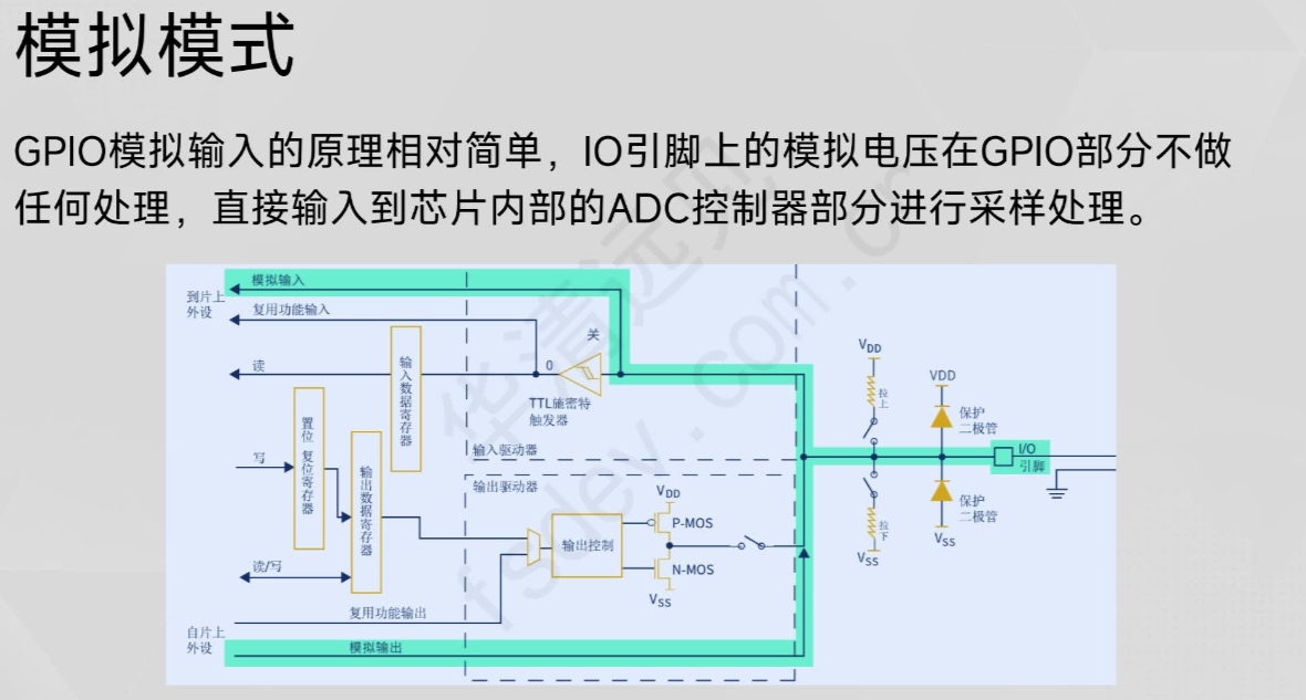 GPIO模拟输入的原理是IO引脚上的模拟电压在GPIO部分不做任何处理,直接输入到芯片内部的ADC控制器部分进行采样处理。ADC模数转换器