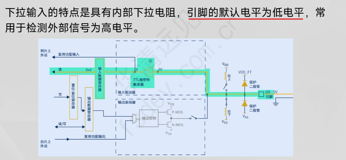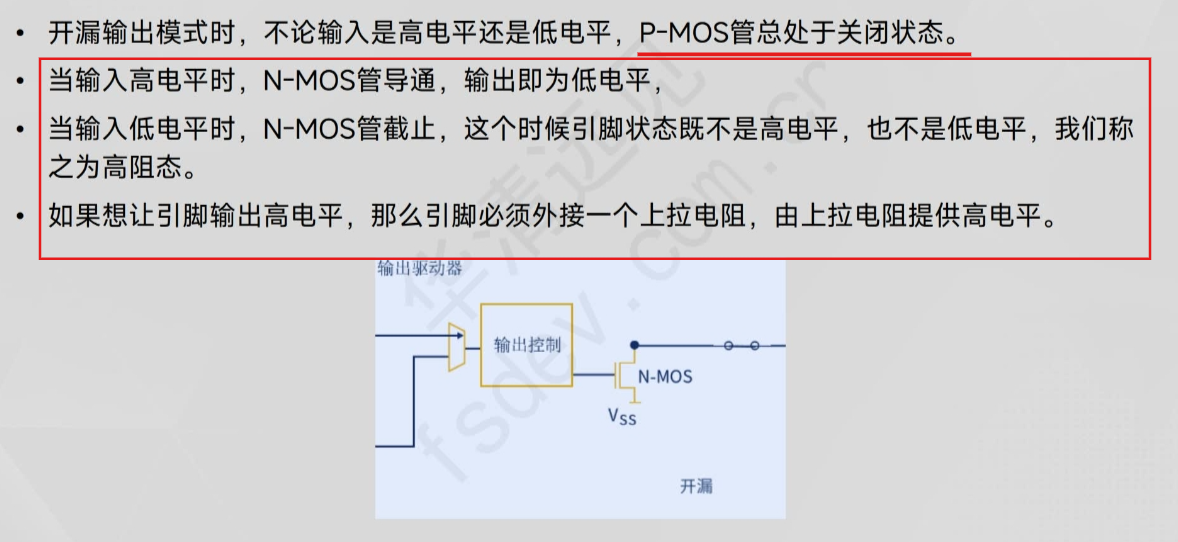 开漏模式下设置下拉电阻不论高低电平都输出0(低电平),此时开漏模式无意义。