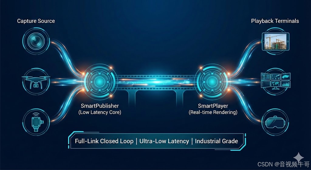 也正因为此,本文不会把大牛直播SDK简单当成"另一个播放器方案"来横向对比,而是试图从 行业坐标、协议栈权重、延迟定义的本质、以及架构形态 四个维度,说明在工业、安防、低空经济和具身智能这类系统级场景里,我们真正需要的,不是一个 UI 友好的"播放器控件",而是一块可以嵌入业务闭环的 流媒体内核------它既是数据的入口,也是控制闭环的关键一环。