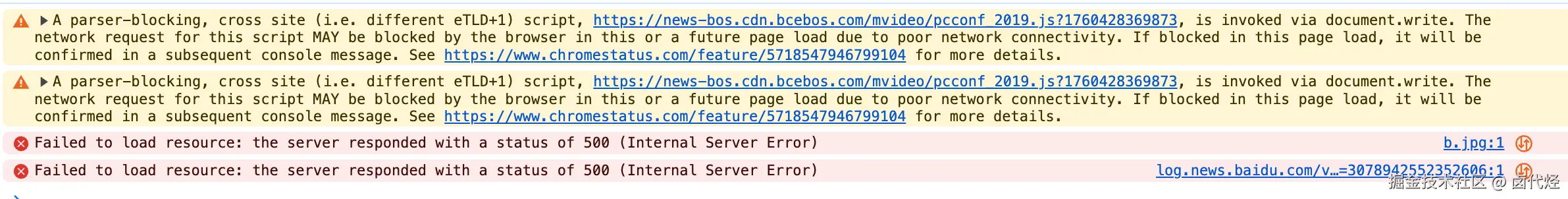 A parser-blocking, cross site (i.e. different eTLD+1) script, https://news-bos.cdn.bcebos.com/mvideo/pcconf_2019.js?1760428369873, is invoked via document.write. The network request for this script MAY be blocked by the browser in this or a future page load due to poor network connectivity. If blocked in this page load, it will be confirmed in a subsequent console message. See https://www.chromestatus.com/feature/5718547946799104 for more details.