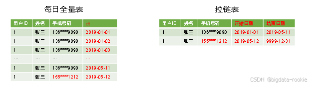 比如:用户信息会发生变化,但是每天变化的比例不高。如果数据量有一定规模,按照每日全量的方式保存效率很低。