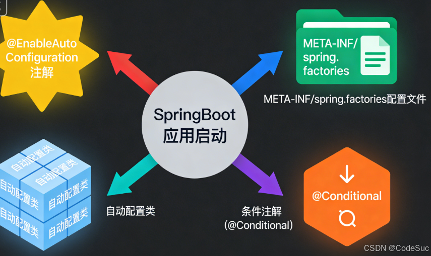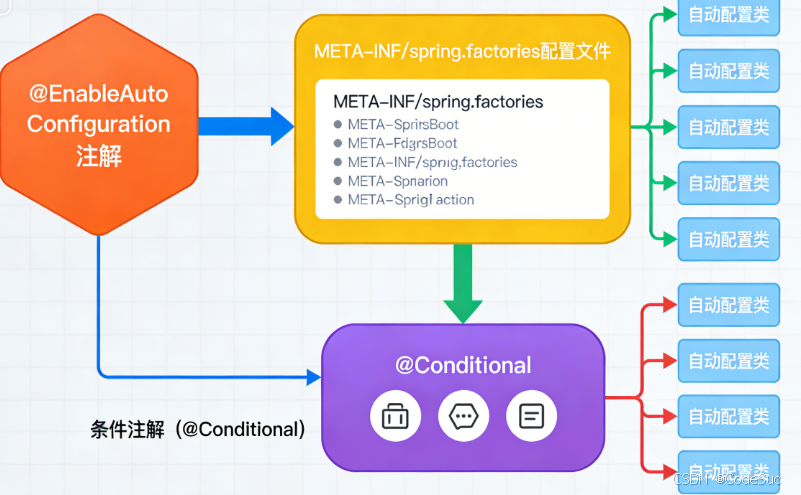 核心触发机制:@SpringBootApplication注解中的@EnableAutoConfiguration注解是自动配置的"开关",通过导入AutoConfigurationImportSelector类加载自动配置类;