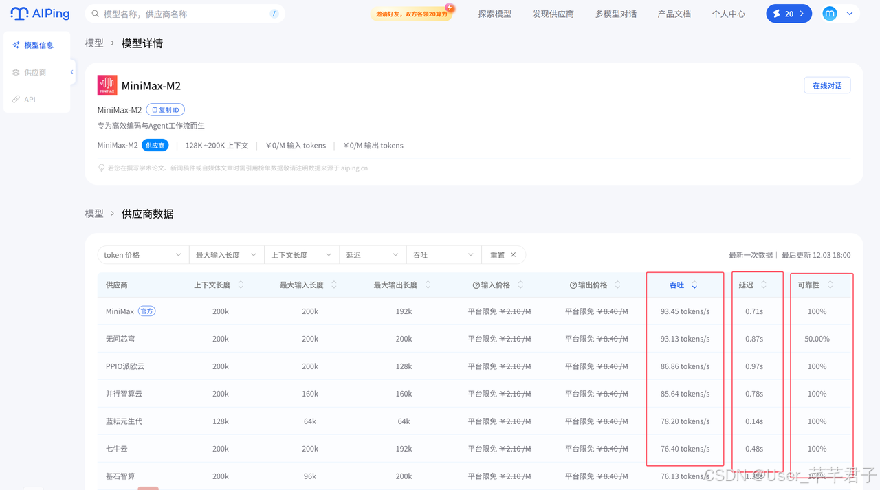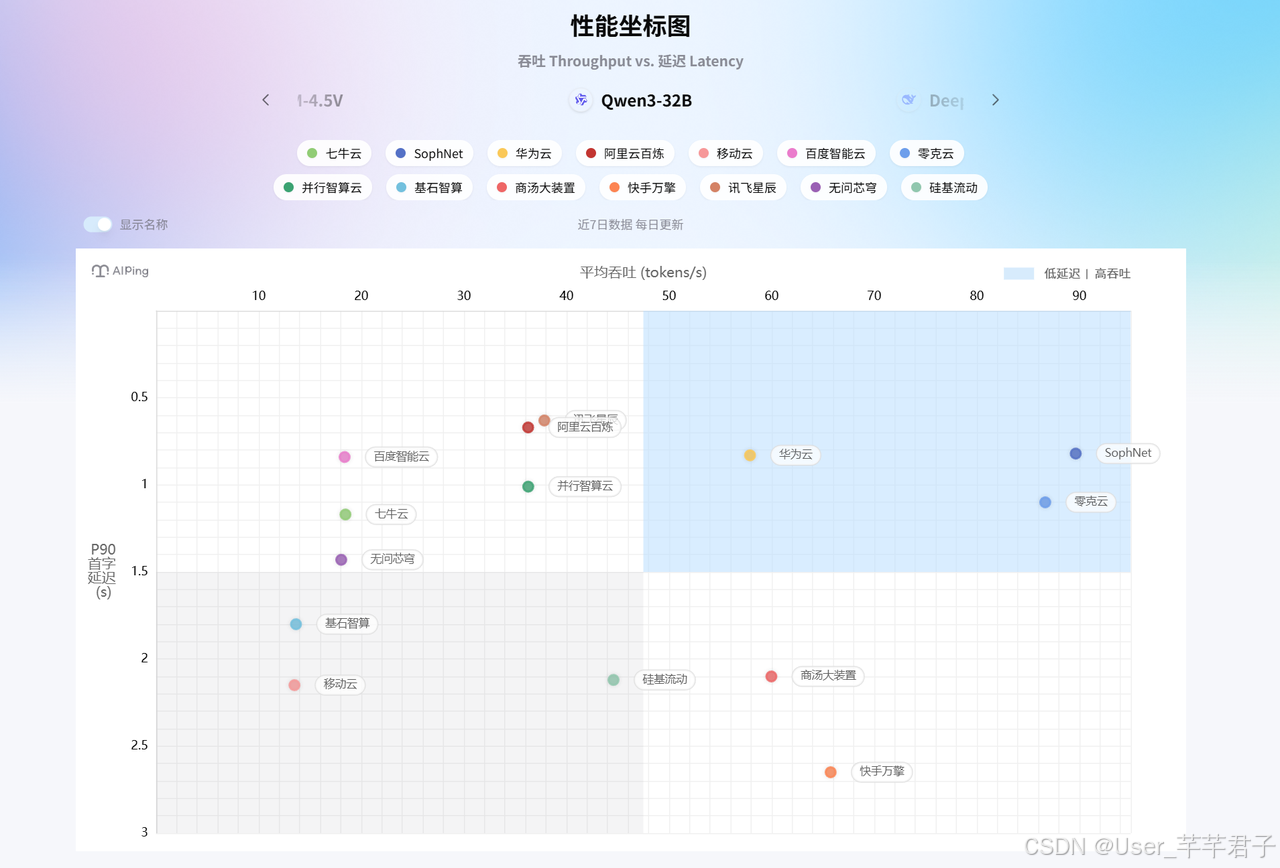 平台以P90延迟、吞吐(每秒处理的token数量)、可靠性(服务可用性)、为核心评测维度,通过高频率、多时段、长周期的不间断测试,生成实时更新的性能数据 。关键功能包括: