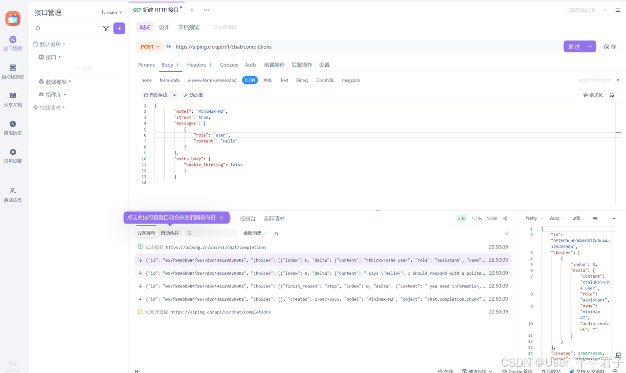 - 先Body,JSON,modle自己的大模型,我选择的是MiniMax-M2