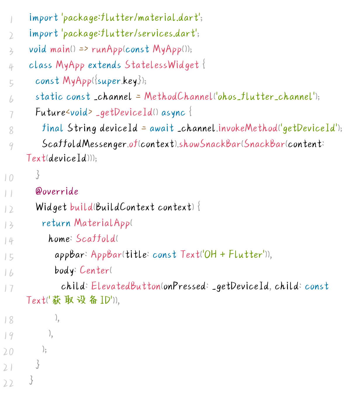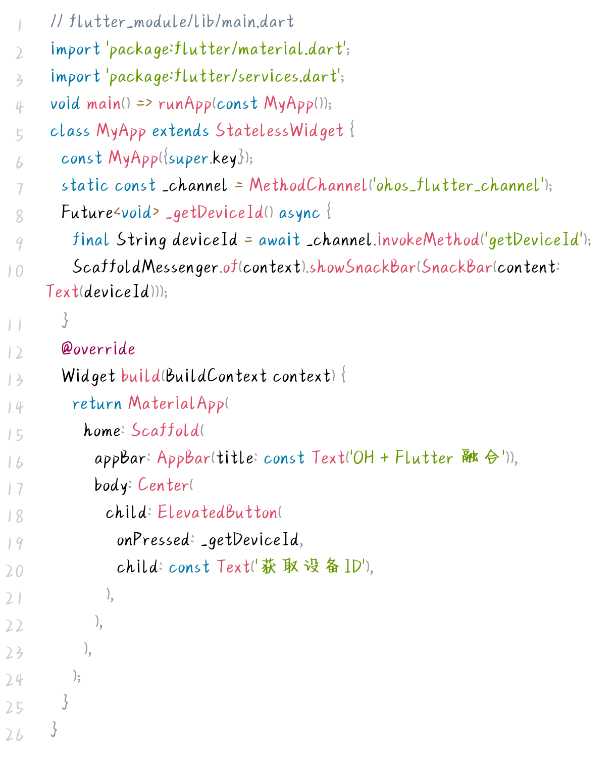 Flutter 模块仅需实现一个包含按钮交互的极简页面,并通过 MethodChannel 调用 OpenHarmony 原生能力,代码如下: