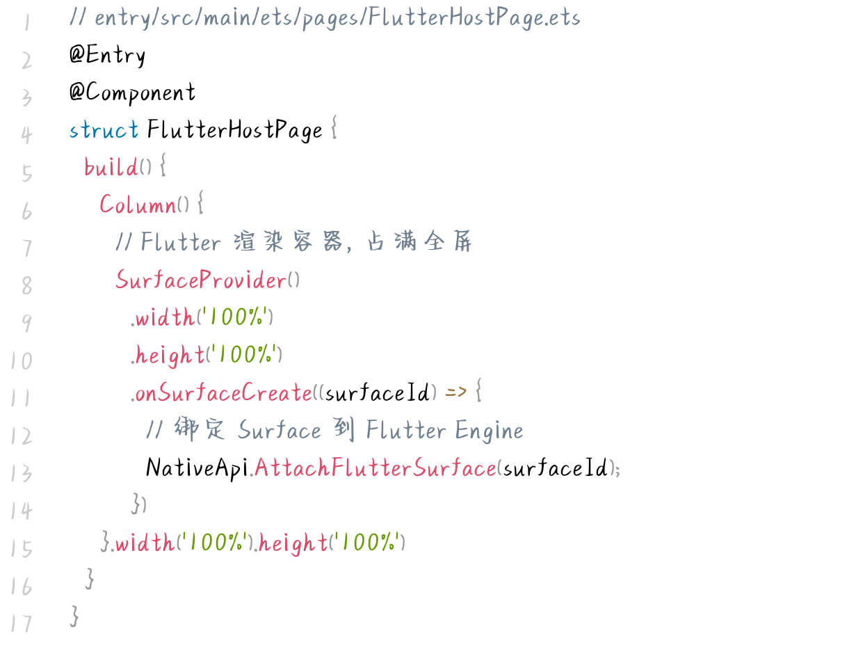 在 ArkTS 层,通过 SurfaceProvider 组件为 Flutter 提供渲染载体,并在 UIAbility 中完成 Engine 初始化与生命周期联动,代码如下: