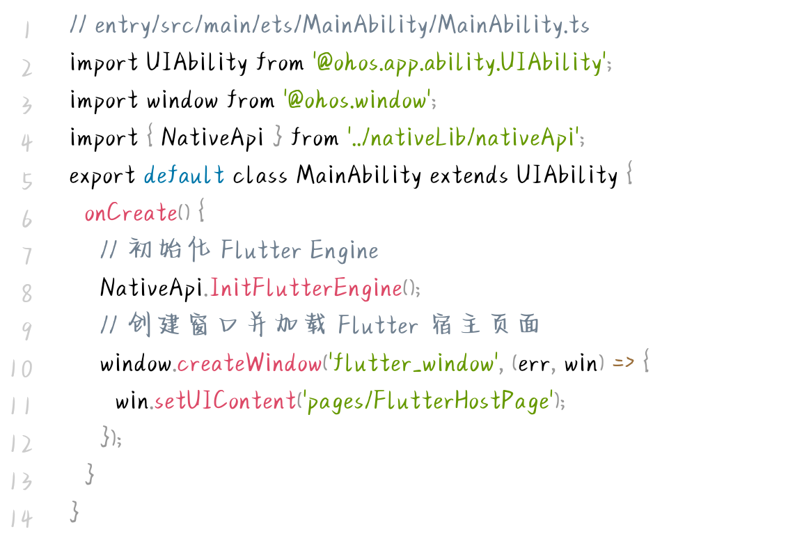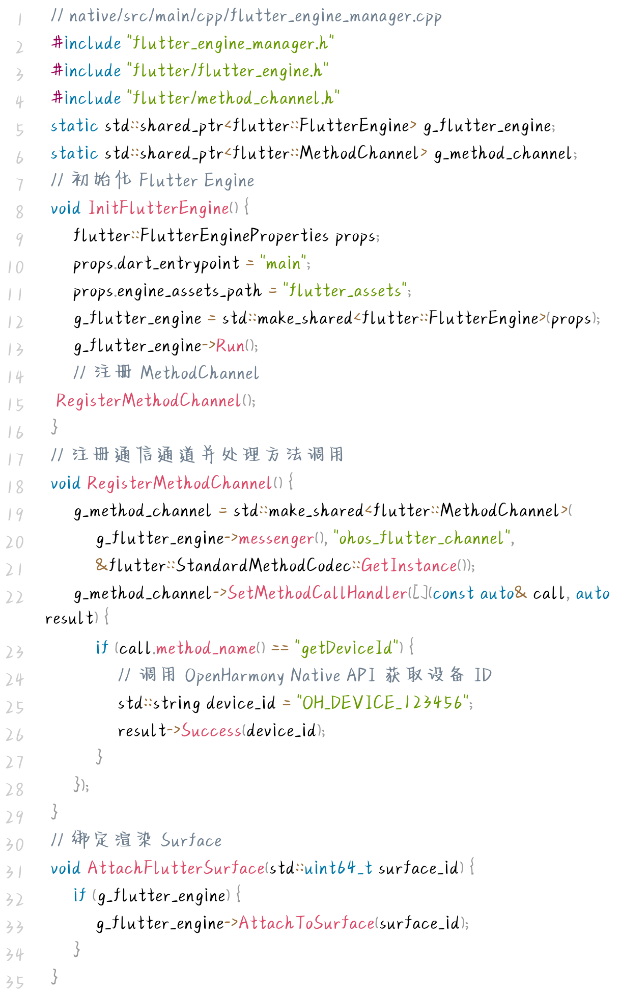 OpenHarmony 原生层通过 C++ 代码完成 Flutter Engine 的启动与通信通道的注册,代码聚焦核心逻辑,极简实现如下: