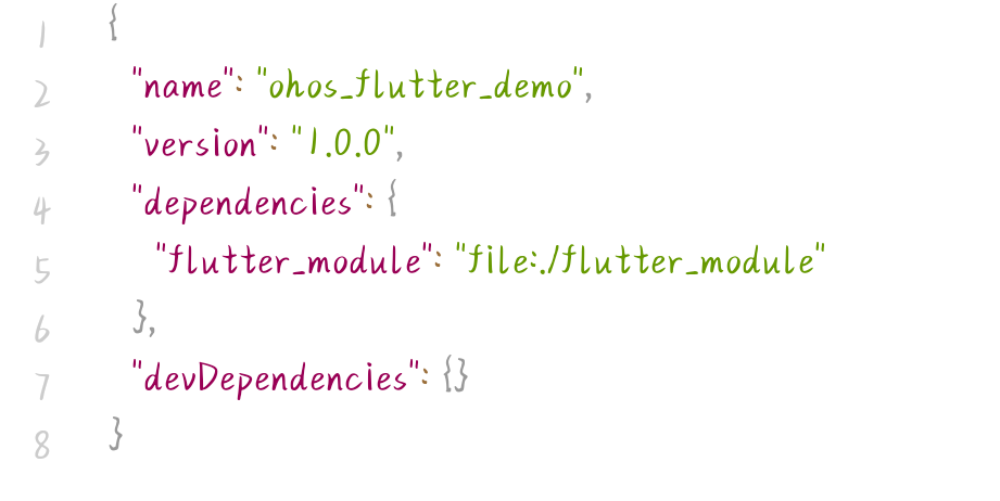 编辑 OpenHarmony 工程根目录下的 oh-package.json5 文件,添加 Flutter 模块的依赖声明,使 OpenHarmony 工程能够识别并加载 Flutter 模块: