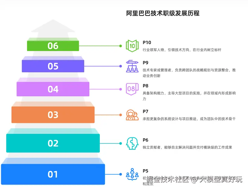 在阿里巴巴,技术人的职级从 P5 到 P10,每一级都对应着不同的职责与能力要求。