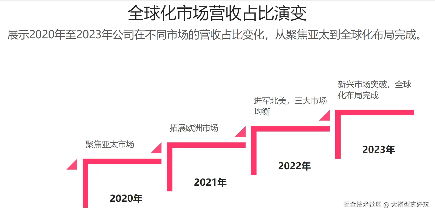 智能体成功理解了时间序列数据,并选择了一个合适的时间线模板进行展示。它将各年份的市场分布数据提取并结构化,生成了一份基本可用的信息图。当然,与官方 AI Infographic 的产出相比,在细节优化、图表精准度和视觉丰富度上还有差距,这可能与提示词的完整性、模型参数调优等因素有关,值得进一步探索和优化。