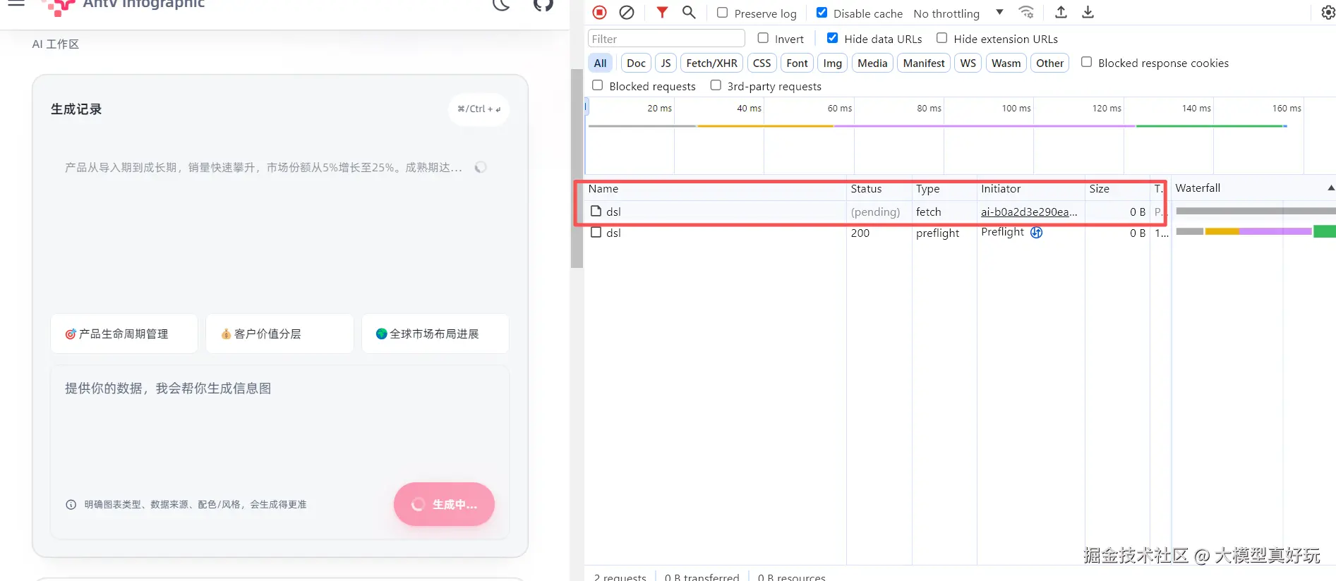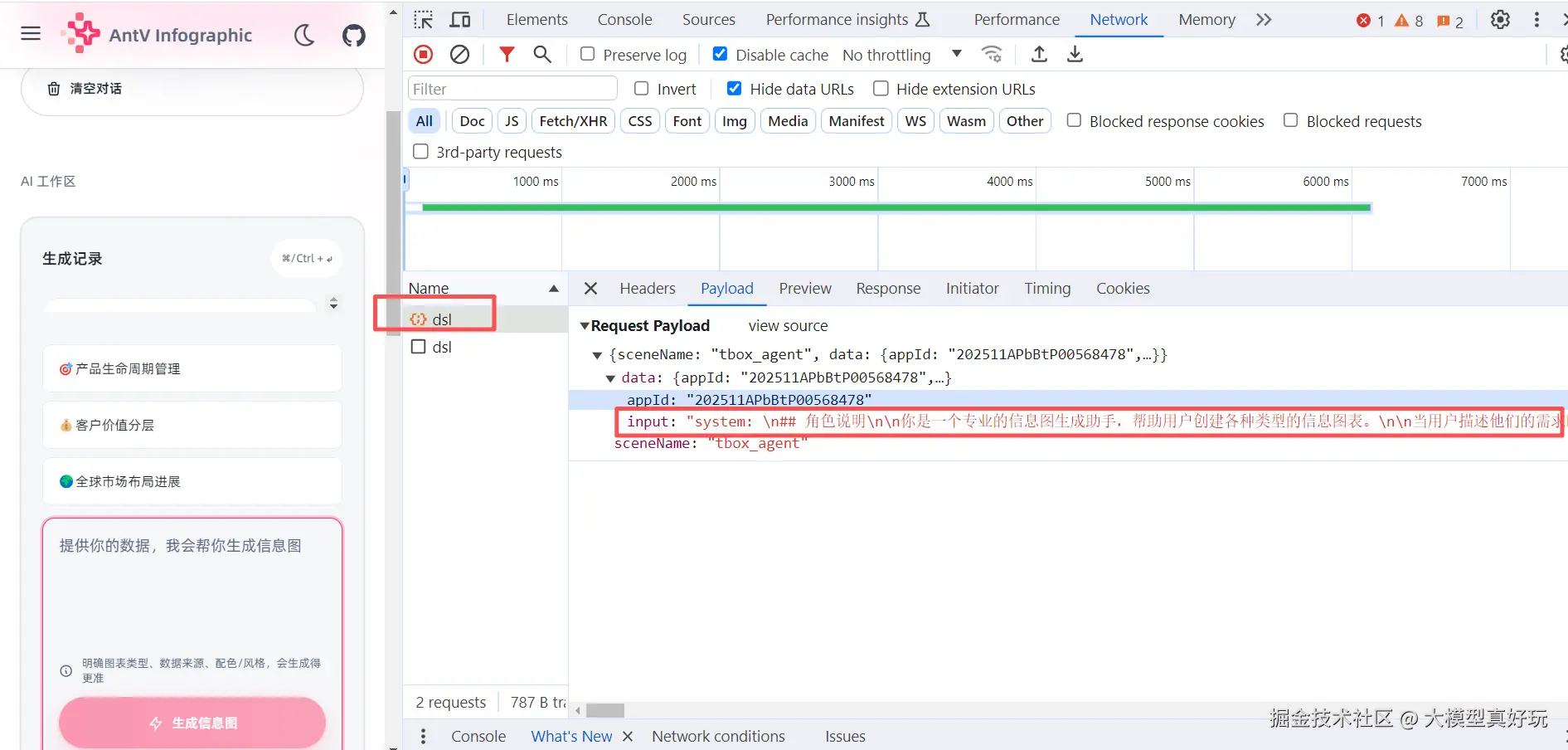 为了让大模型掌握这项技能笔者需要给它一份"说明书"。最直接的方式就是借鉴官方 AI 功能的提示词(Prompt)。通过浏览器的开发者工具(Network 面板)笔者捕获到 AI Infographic 网站与大模型交互时使用的提示词模板。
