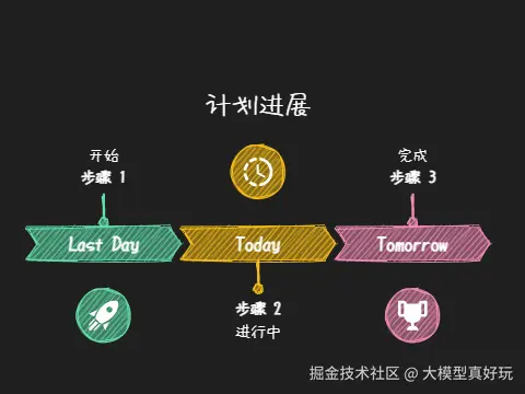 下面是一个完整的代码示例,它创建了一个包含三个步骤的"计划进展"图: