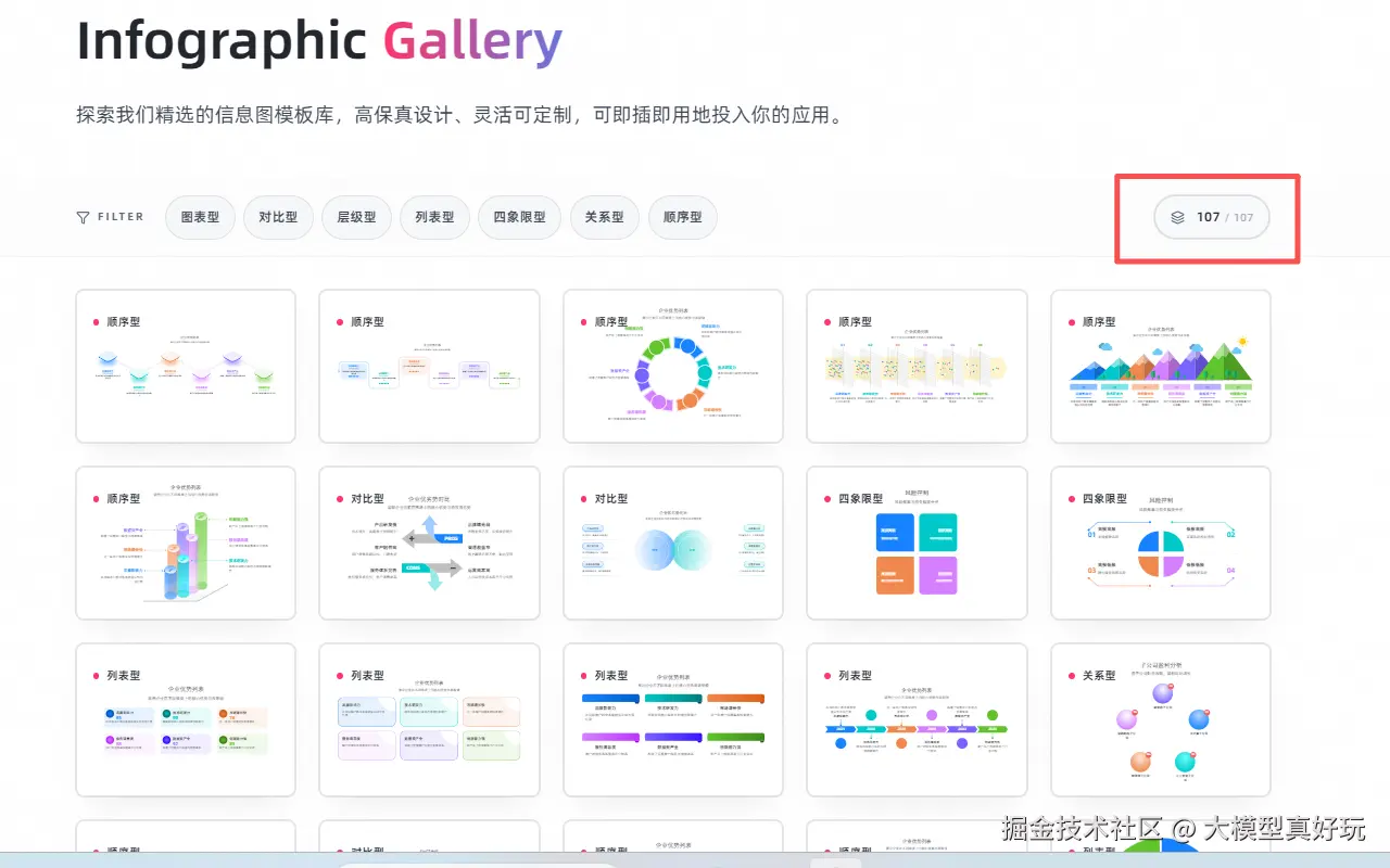 对于常见的图表类型,每次都从头配置 design 显然效率不高。为此,Infographic 提供了模板(Template) 功能。用户可以将一套成熟的 design 配置保存为模板,以便复用。