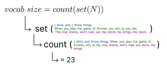 注意点:这里举例比较简单,是英文,我们直接空格分词就行。如果是中文的话,我们一般用jieba分词。分词结果去重后,就是总的词汇量。