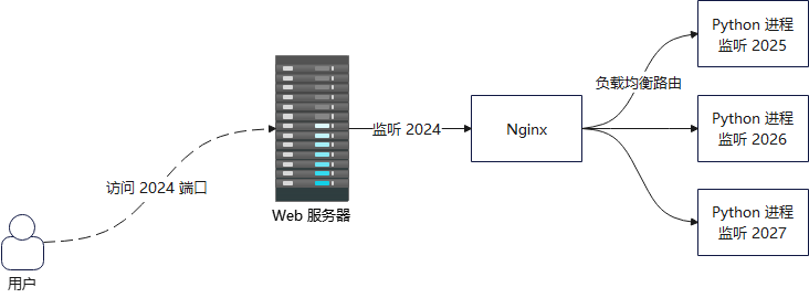 然后前端 Nginx 监听端口 2024 ,用户访问 Web 服务器的 2024 端口,Nginx 再通过负载均衡,将流量通过端口(2025,2026,2027)路由到后端的 Python 进程