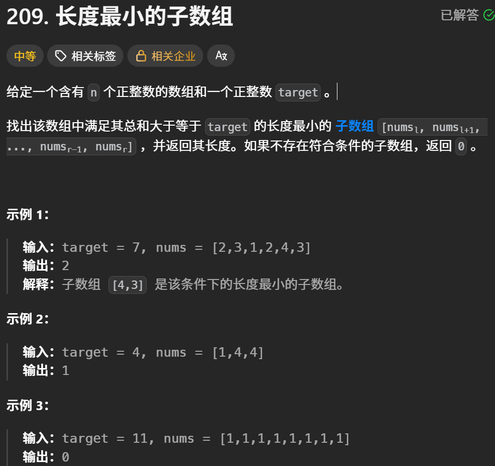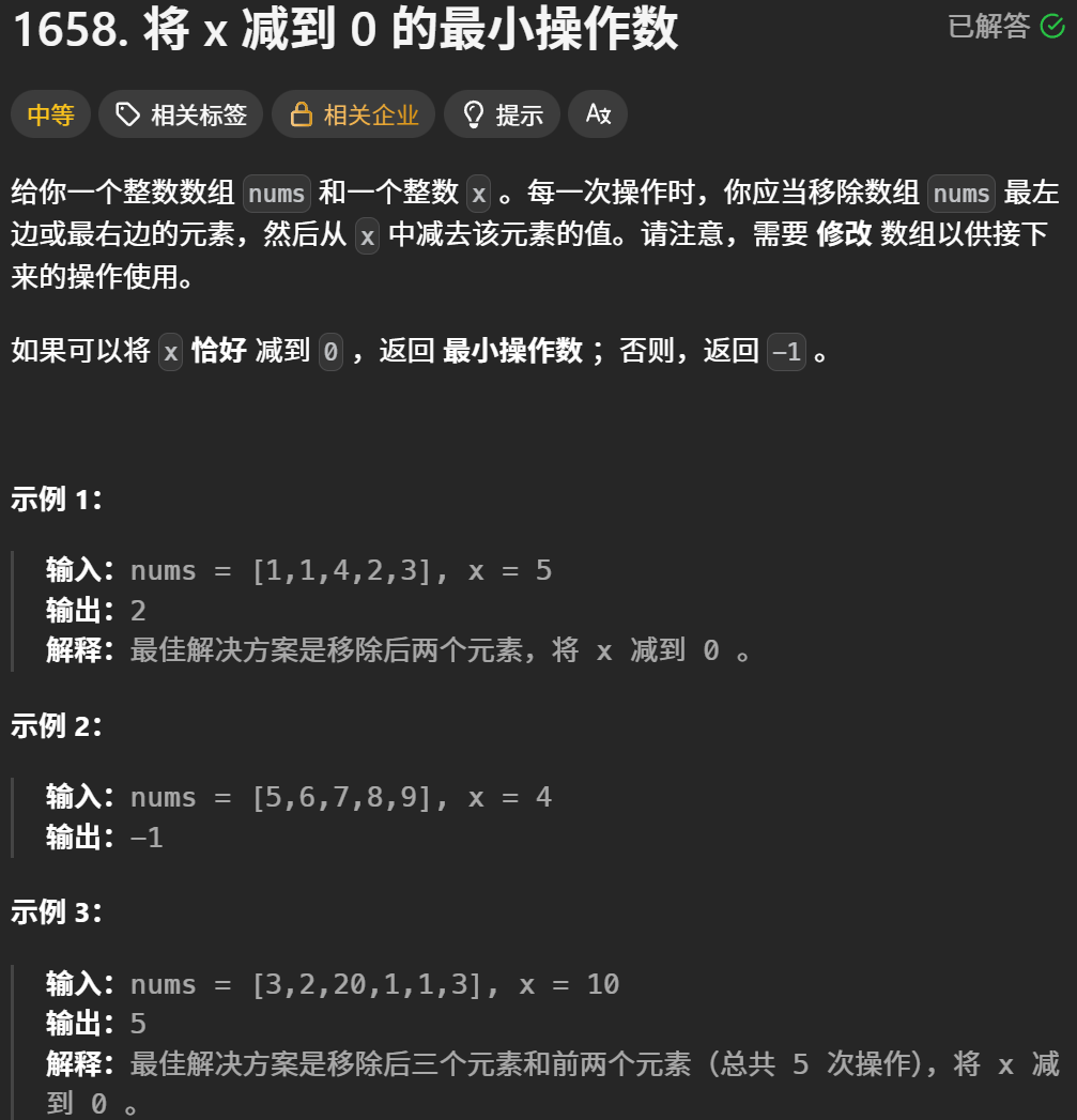 这道题同样也有一个非常巧妙的转化方法,原题目要求只能减去最左边或者最右边元素的值,最后使x变为0,相当于要最左边的部分元素与最右边的部分元素相加为x,且要用最少的元素,那我先算出一整个数组所有元素累加sum的值,然后令target = sum - x,那题目是不是可以转化为找到最常的子数组,使子数组的元素相加为target,同时记录子数组的长度,最后用数组的长度减去最长子数组的长度,就得到了最少操作数。