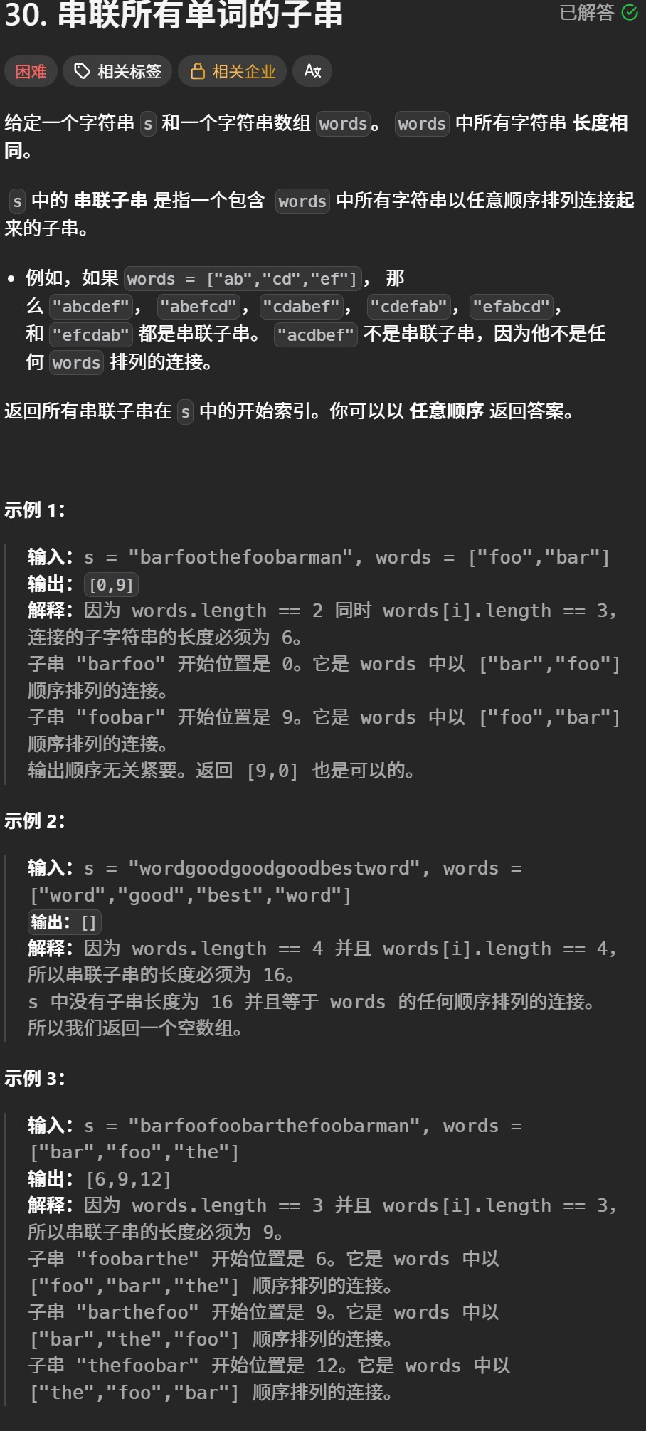 本题与上一题有异曲同工之处,上一题我们记录的是字符,本道题则要记录字符串。先定义一个哈希表hash1,遍历字符串数组words,将里面的字符串以及出现的个数记录到hash1中,设字符串数组words的长度为m,以及数组中每一个字符串的长度为len(每一个字符串长度相同)。这次定义的双指针的right往右也不再是一步一步走了,而是一个字符串一个字符串地走,因此,left和right的起始位置要考虑len种,所以最外层要套一层for循环(i=0;i<len),里面定义第二个哈希表hash2,left和right的初始位置下标为i,同时定义count为0(关键),right向右移动,从right开始,把长度为len的字符串放入hash2中,如果该字符串在hash2的数目小于等于hash1内的数目,则count++,如果区间长度大于了words内所有字符串加起来的长度(len*m),则进行出窗口操作,从left开始,长度为len的字符串,如果它在hash2的次数小于等于在hash1的次数,则count--,然后该字符串在hash2的次数也减1,left向右移动len长度。如果count == m,则此时的区间内的字符串是符合题目要求的字串,left为起始索引,将left加入到vector中,循环重复以上操作即可,最后返回该vector即可。