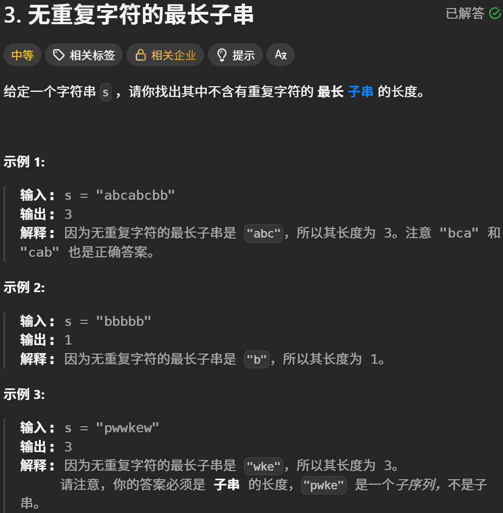 和上一题的道理其实差不多,依旧是定义两个指针放在下标为0的位置,right指针向右移动,上一题是通过sum来记录累加,这道题要找出无重复字符的最长字串,那么可以把right对应的字符放在哈希表里,同时记录出现的次数(进窗口),这很容易想到用unordered_map来进行记录,当出现重复字符,也就是right对应的字符出现的次数大于1时,将left对应的字符在哈希表里出现的次数减去1,同时left++(出窗口),直到right字符出现的次数变为1。若没有出现重复字符且此时的区间长度大于len,则更新len的长度(len初始化为0),这样可以保证记录出现重复字符前的无重复最长字串的长度,重复以上操作,最后right越界则结束操作,返回len即可。