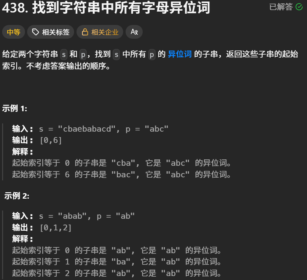 先定义一个静态哈希表hash1,遍历字符串p,将其中所有字母以及出现的数目记录到哈希表中,然后定义变量count(关键)和第二个静态哈希表hash2。定义两个指针在下标为0的位置,开始遍历字符串s,将right对应的字符记录到hash2中,记录其出现的次数,如果记录到hash2的该字符的次数小于等于hash1内该字符的次数,则让count++。当left和right之间的区间的长度大于字符串p的长度时,开始出窗口操作,如果left对应的字符在hash2的数目小于或等于在hash1的数目,则count--,然后left++,同时该字符在hash2内记录的次数也减1。当count == p.size()的时候,此时区间内的字串就是符合题意的异位词,而left就是起始索引,把left记录到vector即可。重复以上操作,right越界则操作结束,最后返回该vector即可。