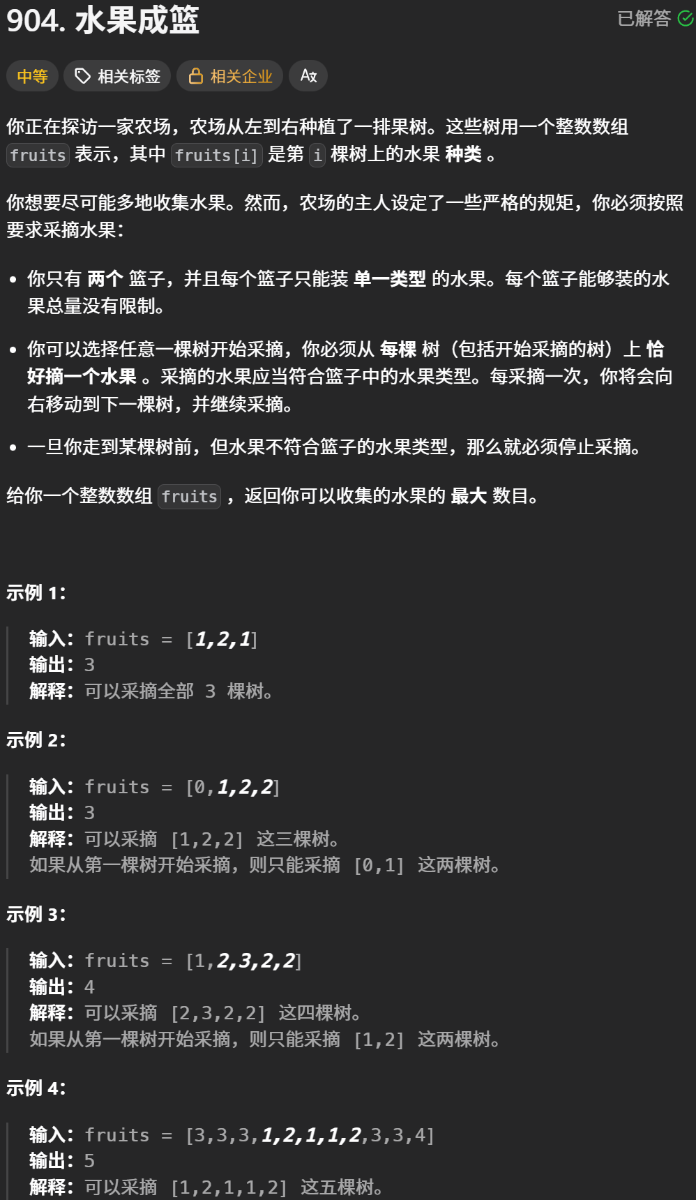 可以借助哈希表进行记录,记录每一个种类的水果以及其数目,同样利用双指针,right向右移动的同时记录入哈希表,用哈希表的size来记录水果的种类,如果记录的种类超过2,则进行出窗口操作,left向右移动,并把出窗口的对应的水果数目减1,当哈希表内某种水果的数目变为0的时候,将其从哈希表中删除,此时哈希表内的种类变为2,停止出窗口操作。如果哈希表内的水果种类小于等于2,且区间长度大于len,则更新len为最大区间长度,重复以上操作,right越界则停止操作,最后返回len即可。