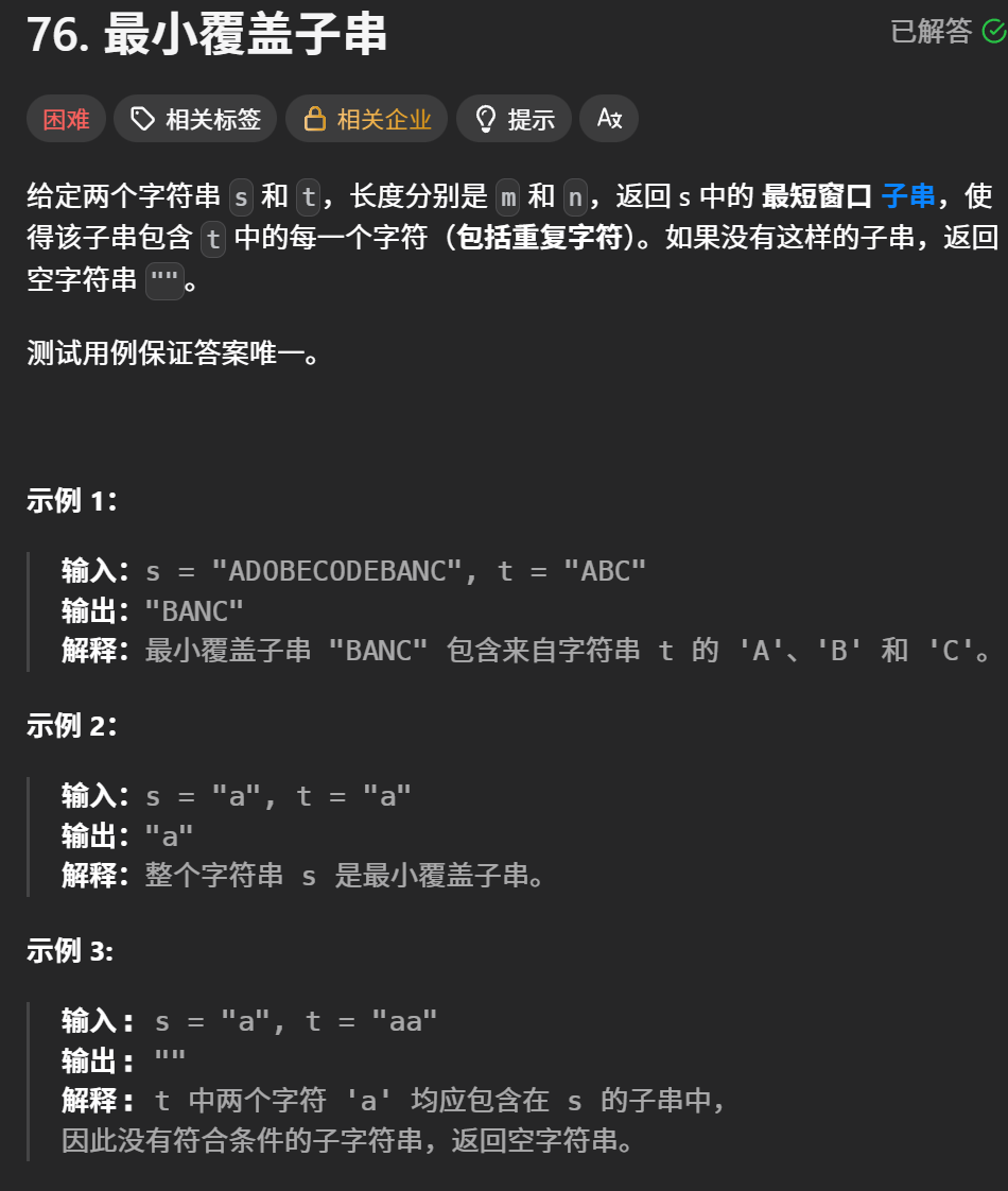 先定义一个静态哈希表hash1,同时遍历字符串t,将其中每个字符和对应的出现次数记录到hash1中,设m为t的长度,再定义第二个静态哈希表hash2和count(关键),定义双指针在下标为0的位置,right向右移动,同时把对应的字符以及出现次数记录到hash2中,如果该字符在hash2中出现的次数小于等于在hash1出现的次数,则count++,就这样一直往右走一直加,直到count == m,此时区间内就覆盖了t中所有的字符,如果区间长度小于minlen(初始化定义为INT_MAX),则更新minlen为该区间长度,同时更新begin的位置为当前left的位置,即最小覆盖字串的初始位置(begin的初始值为-1),同时进行出窗口操作,如果left对应的字符在hash2出现的次数小于等于在hash1出现的次数,则count--,循环结束,right继续移动,否则count不变,无论count是否变化,该字符在hash2的次数减1,同时left++,如果count不变,则循环继续,那么最小区间又可以继续更新。如此重复即可,最终判断begin是否仍为-1即未更新,若是,则不存在符合题意的字串,返回空串,若更新,则minlen必定也更新,此时返回从begin位置开始长度为minlen的字串即可。