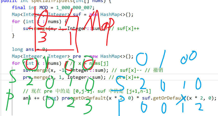这里pre 存储的是当前遍历到x,之前的所有数字以及出现的次数