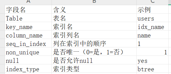 SHOW INDEX FROM 表名\G; -- 纵向显示