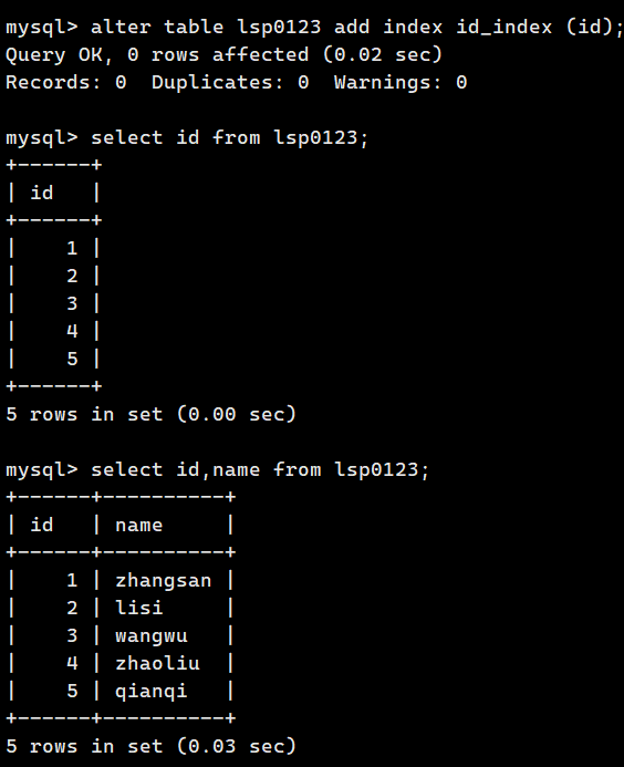 修改表方式创建代码:ALTER TABLE 表名 ADD INDEX 索引名 (列名);