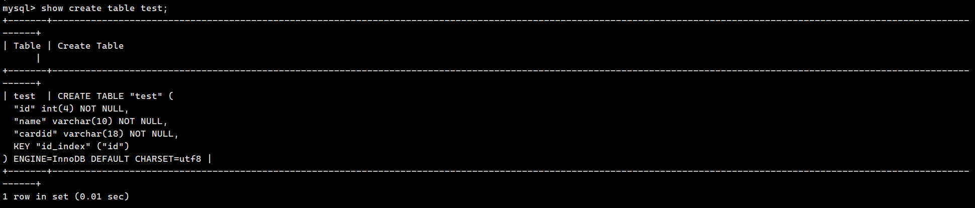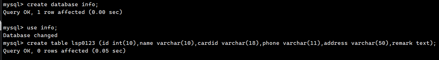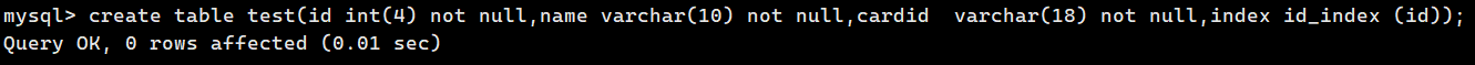 create table yjs1023 (id int(10),name varchar(10),cardid varchar(18),phone