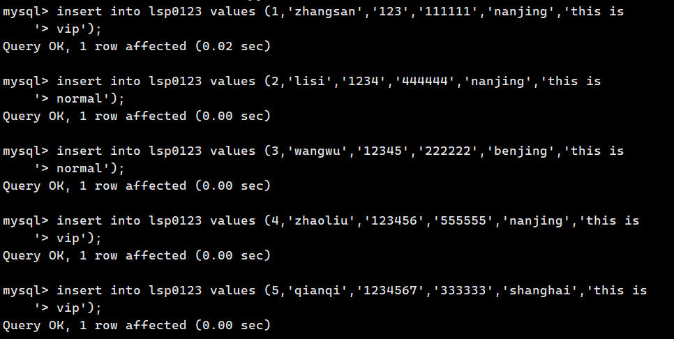 insert into yjs1023 values (5,'zhaoliu','123456','555555','nanjing','this is