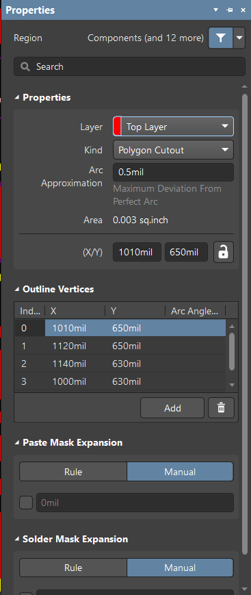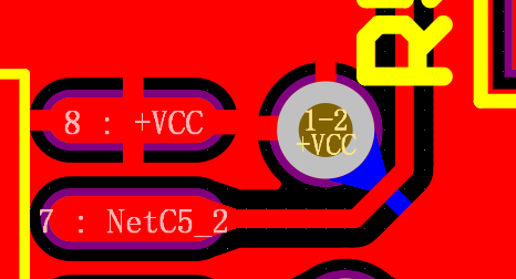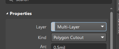 有些时候,我们不希望一些有尖角和细长的部分放置铺铜,这是我们就可以放置cutout。我们来演示一下。我们以这个小区域为例。