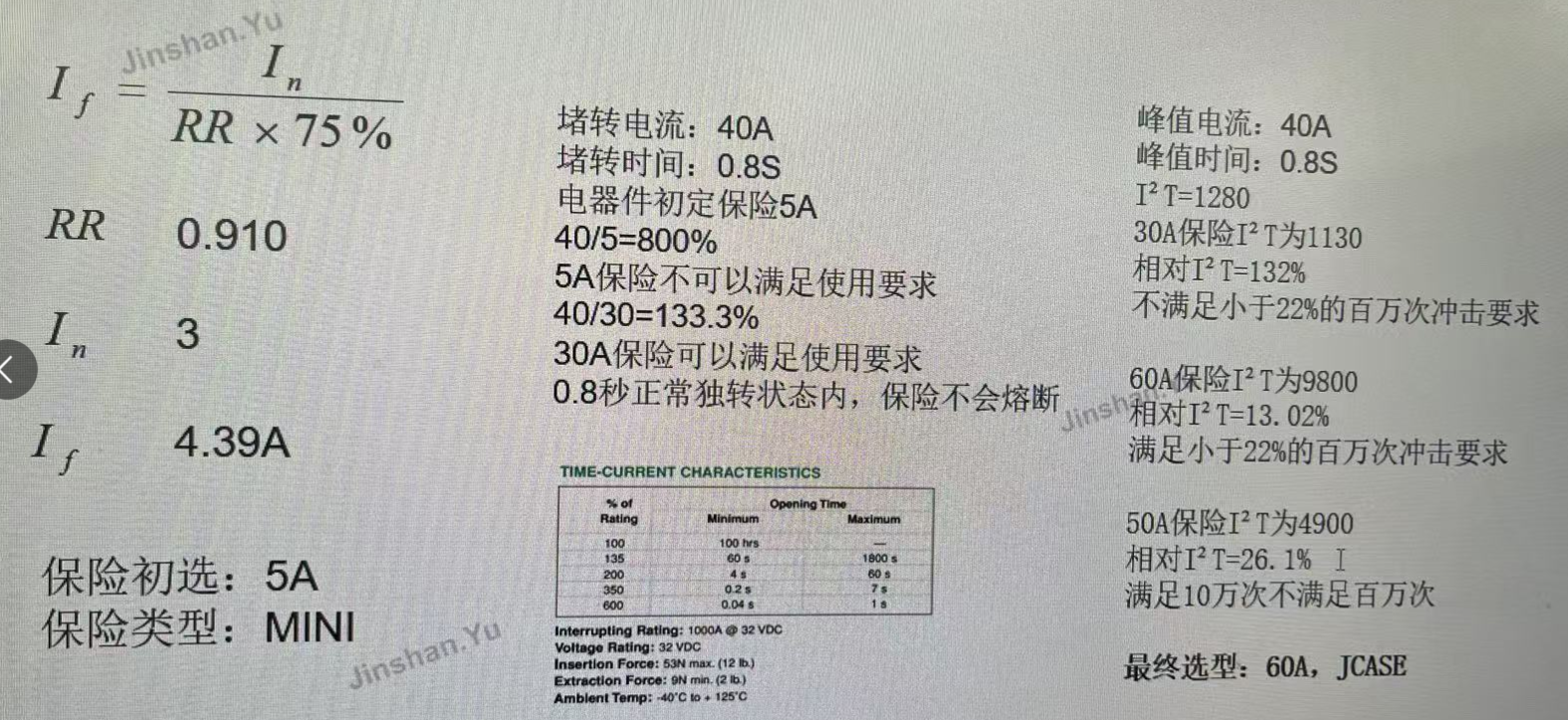 对于有堵转电流/峰值电流的用电器:通过I^2t计算电流累计,对比保险的电流累计,小于22%