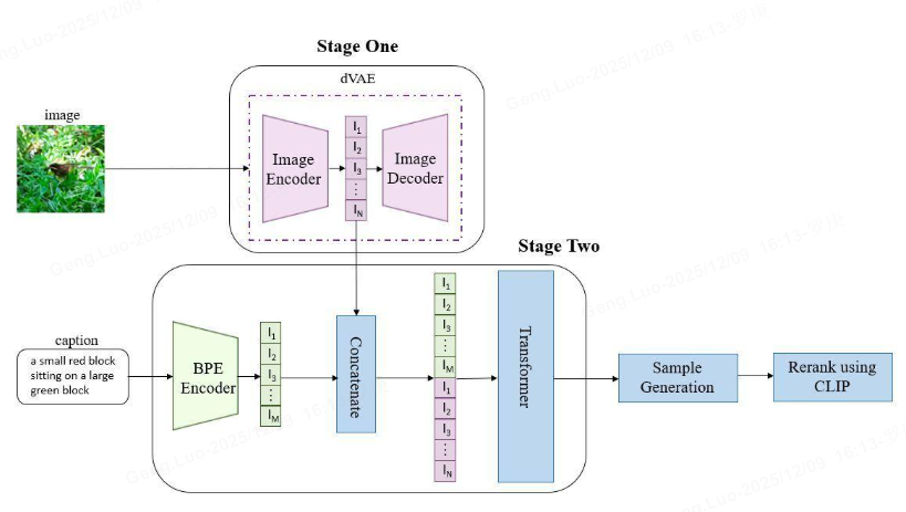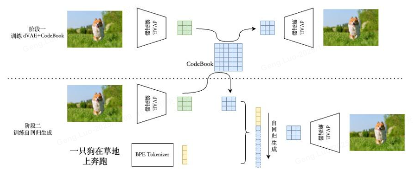 - dVAE编码器:将图像压缩为离散token序列(类似VQ-VAE)。
