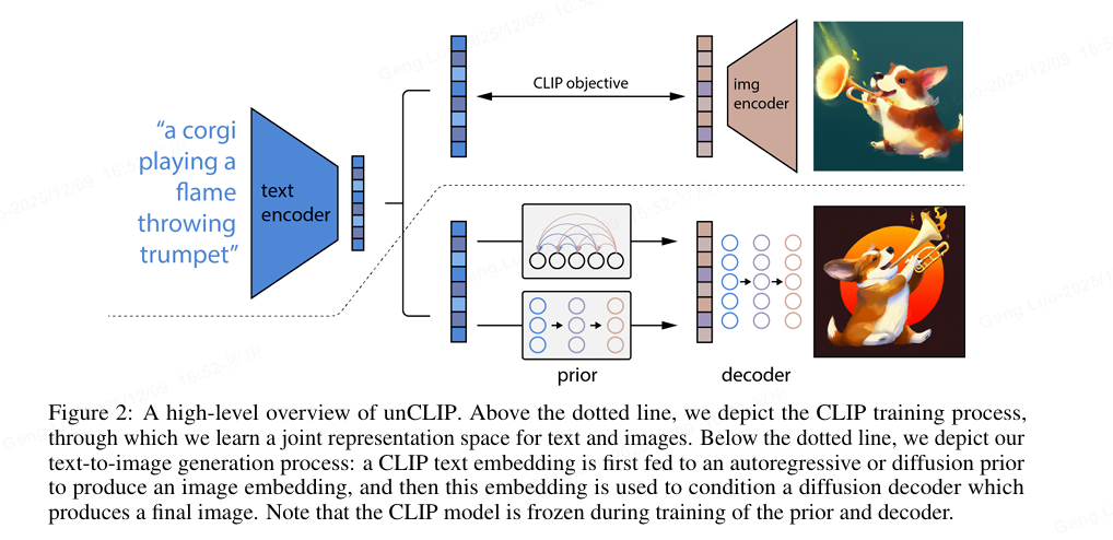 CLIP 模型不仅在 DALL-E 2 的推理生图过程中负责理解文本条件,在训练过程中它也非常重要。训练时,其参数固定,为 decoder 和 prior 的训练提供输入和监督信号。需要训练的 decoder 和 prior 分别是以 CLIP 的图像和文本特征作为输入,其中 prior 的训练还需要 CLIP 的图像特征作为监督信号,decoder 的训练则是以输入原图作为监督信号。
