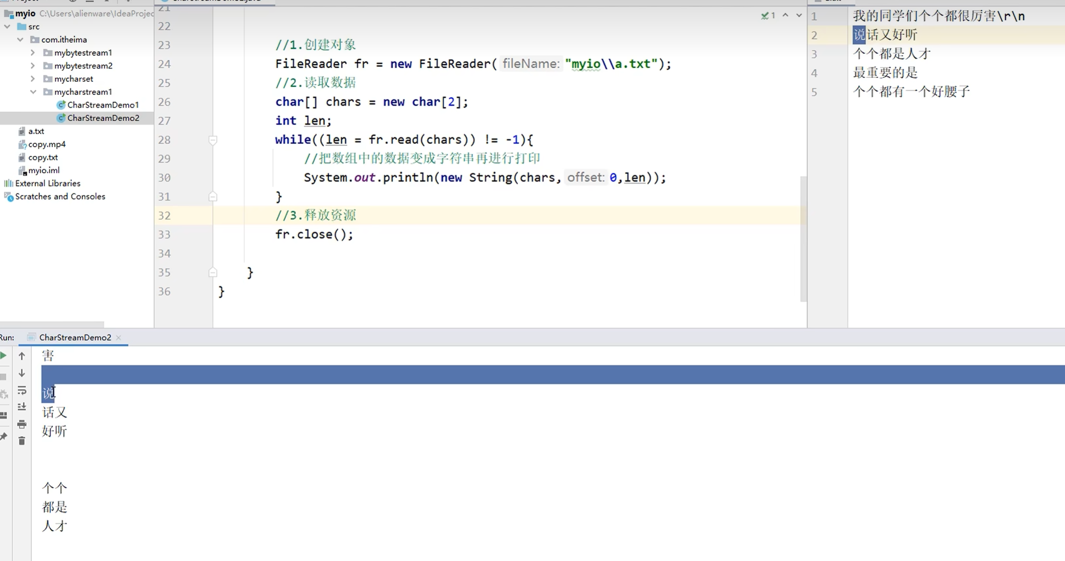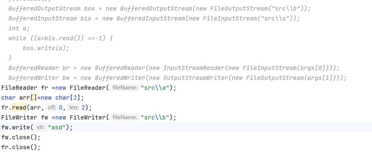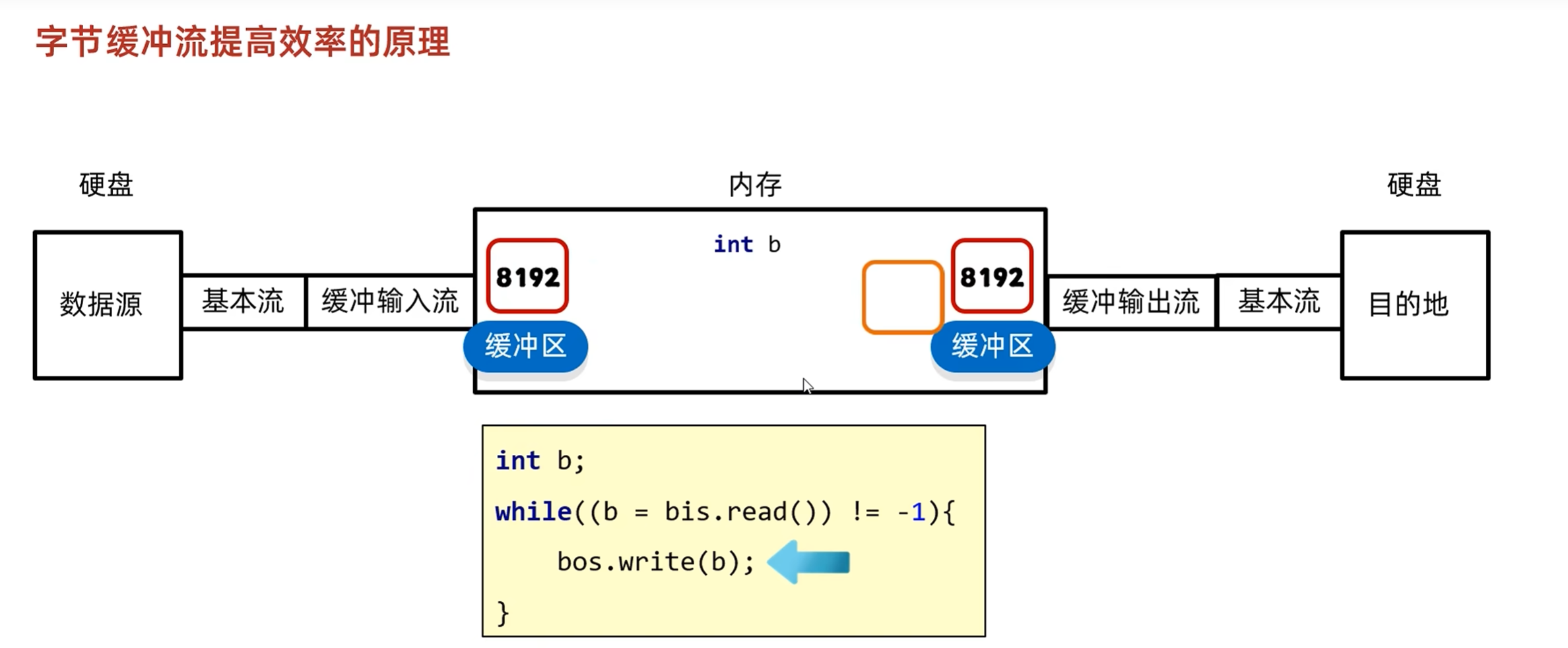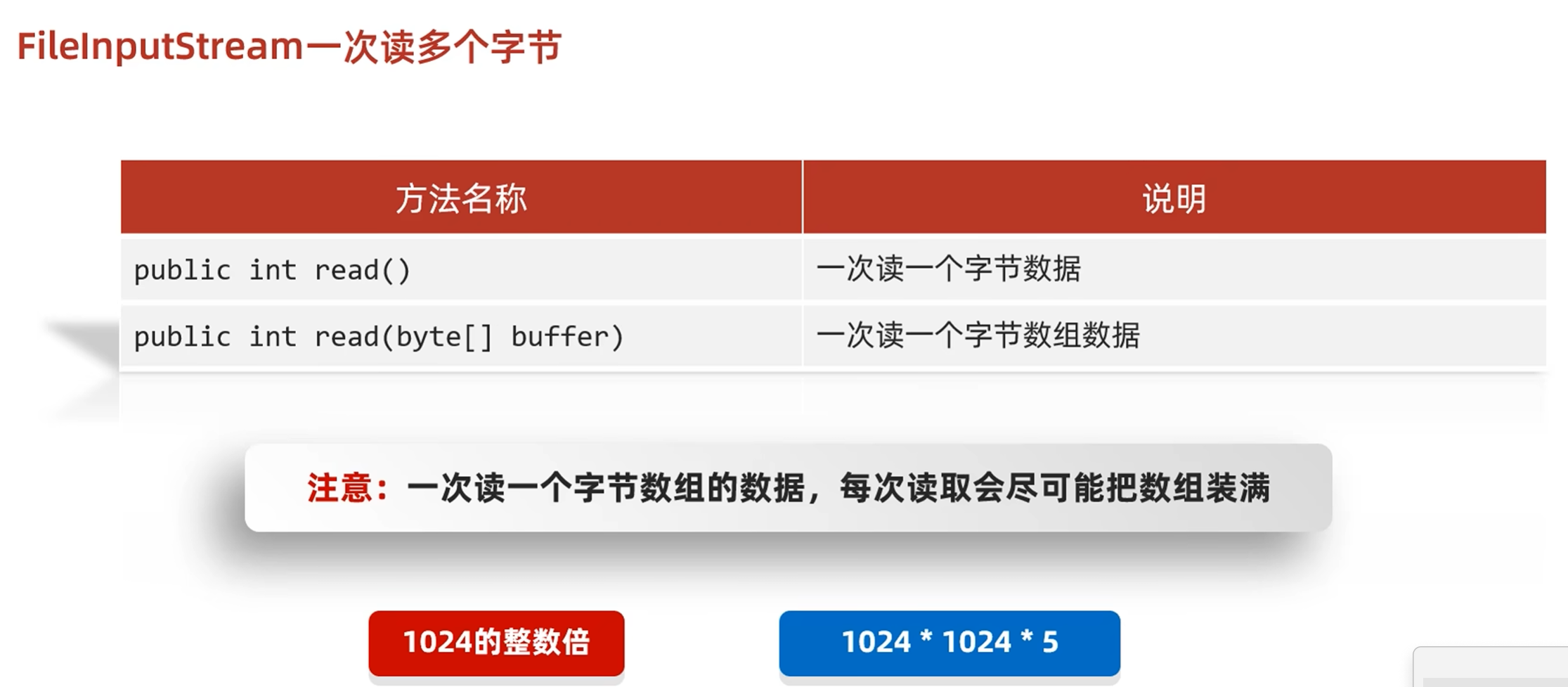 每次在装数据的时候会尽可能的装满(先用fileinputstream创建对象,在用这个对象调用read方法,参数为数组,表示一次性装满一个数组,装不满的时候,用剩余的最后的字符覆盖掉前面的一部分,后面没有覆盖到的地方不变)
