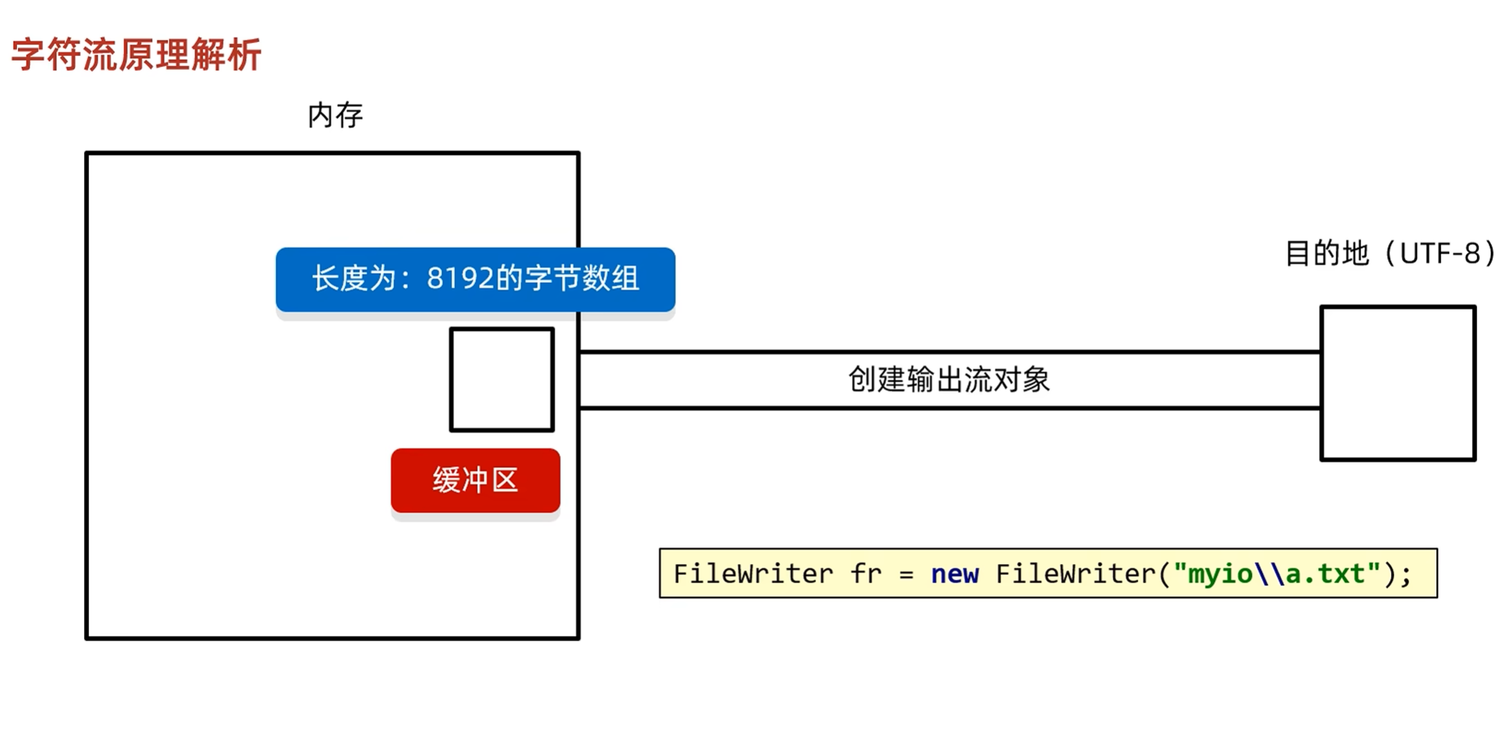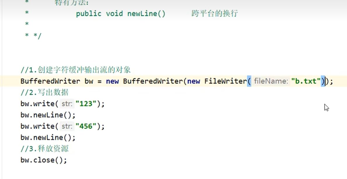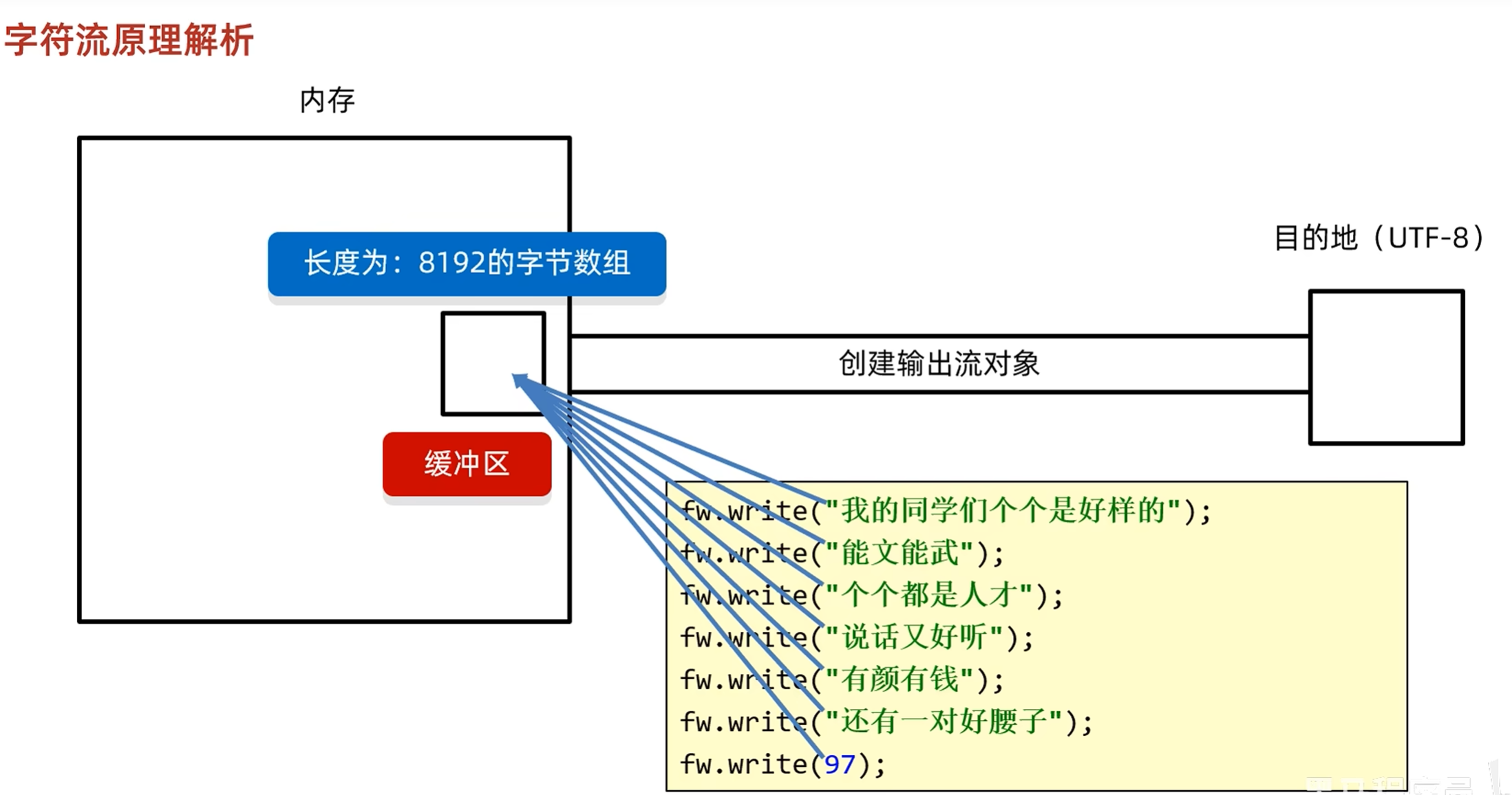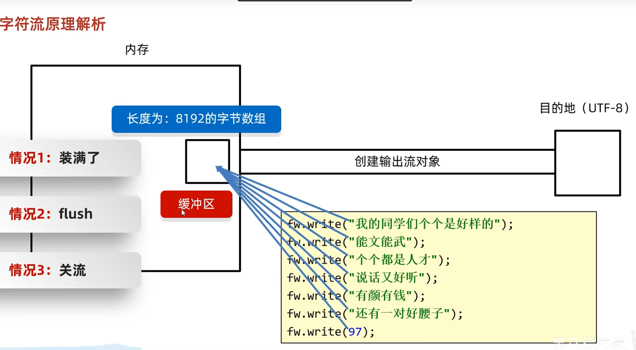 字符流会先写到缓冲区当中,当缓冲区装满时会自动到内存中,或者手动刷新,关流等