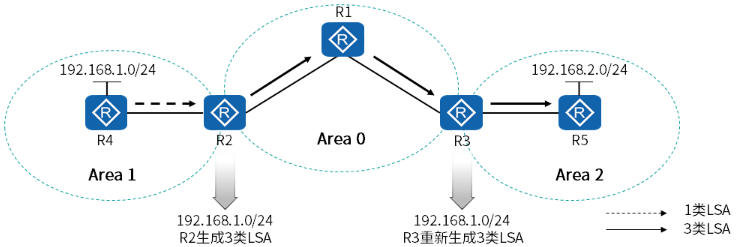 √ R2依据Area1内的1类LSA及2类LSA计算得出192.168.1.0/24路由(区域内路由),并将该路由通过3类LSA通告到Area0。R3根据该LSA可计算出到达192.168.1.0/24的区域间路由。