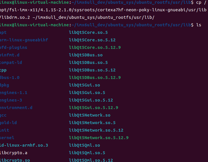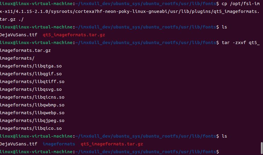 linux@linux-virtual-machine:~$ cp /opt/fsl-imx-x11/4.1.15-2.1.0/sysroots/cortexa7hf-neon-poky-linux-gnueabi/usr/lib/plugins/imageformats/libqjpeg.so ~/imx6ull_dev/ubuntu_sys/ubuntu_rootfs/usr/lib/qt5/plugins/imageformats/