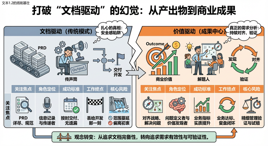 传统的 "文档驱动" 模式最大的陷阱在于,它混淆了手段和目的。它错误地把 "输出了文档(Output)" 等同于 "创造了价值(Outcome)",导致整个团队都在为一份文档忙碌,而不是为业务结果负责。