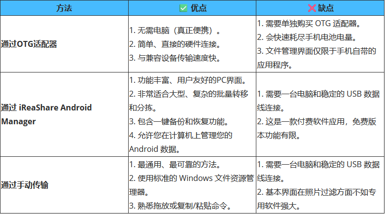 现在您已经学会了三种将安卓手机照片传输到U盘的有效方法。您甚至可以使用iReaShare Android Manager在电脑上管理照片。有了这款软件,无论您是想传输、备份、恢复还是整理文件,都能轻松完成。