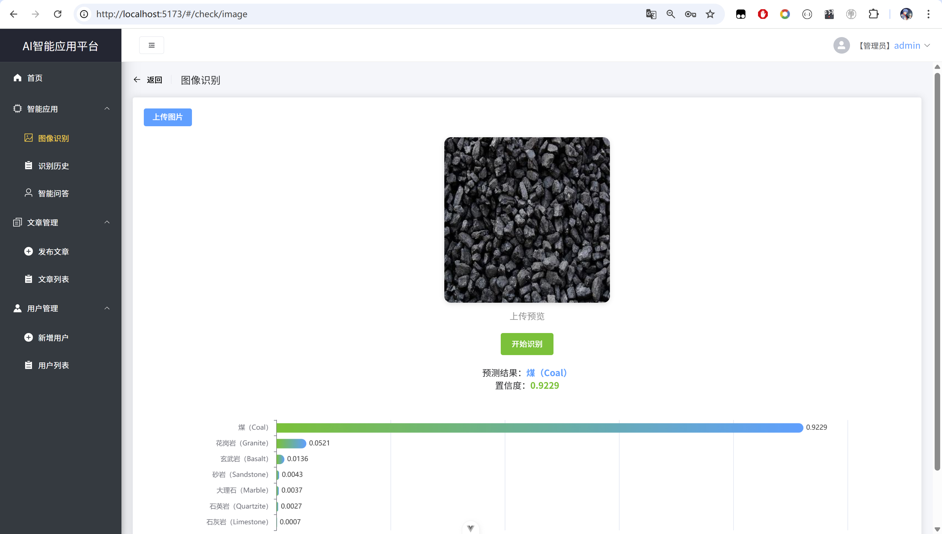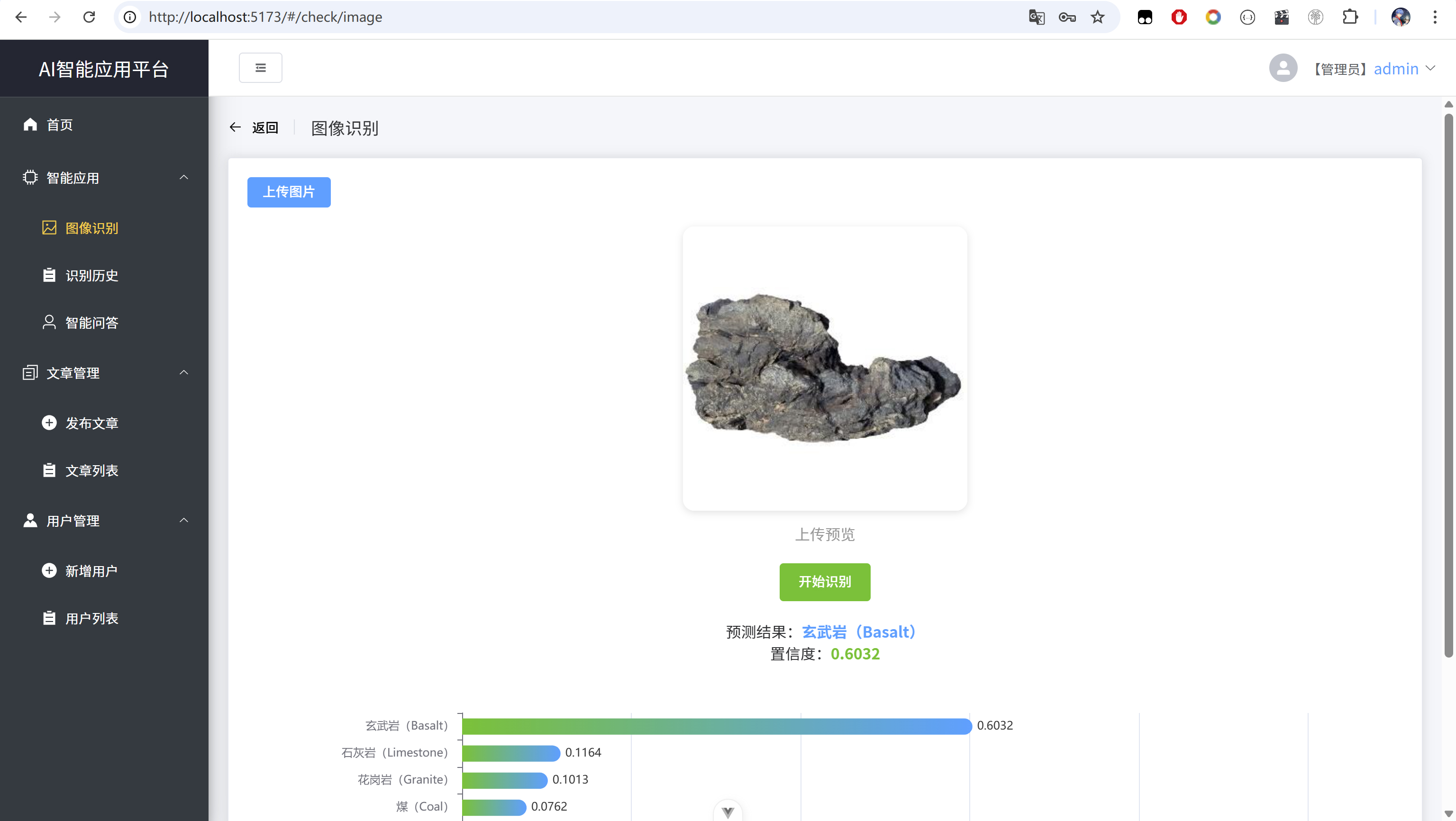 岩石识别是地质勘探、工程建设和资源评估等领域的关键基础工作。然而,传统识别方法高度依赖专业人员的经验与肉眼判断,存在主观性强、效率低且难以普及等局限性。随着人工智能技术的快速发展,基于深度学习的图像识别为岩石种类的自动化、高精度识别提供了全新解决方案。本课题旨在设计并实现一套融合算法识别与业务管理的岩石种类识别系统,以TensorFlow框架搭建卷积神经网络模型,对玄武岩、花岗岩、砂岩等七类常见岩石图像进行训练,构建高精度识别模型。同时,系统结合Vue3与Django开发可视化Web平台,集成图像识别、结果可视化、知识共享与智能问答等功能,不仅提升了岩石识别的准确性与效率,也为地质相关从业人员及学习者提供了一体化的智能工具,具有良好的实用价值与应用前景。