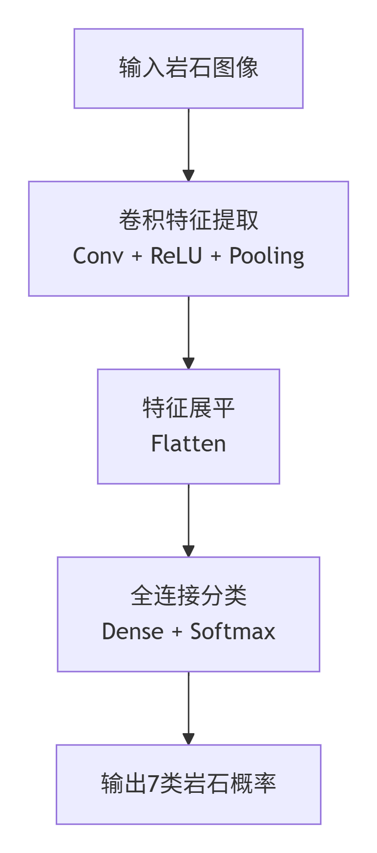 以上代码展示了使用TensorFlow构建CNN模型的基本流程。首先定义了一个包含三个卷积块(每个包含卷积层和池化层)的序列模型,最后通过全连接层输出7类岩石的概率分布。模型使用ReLU激活函数增强非线性,Dropout层防止过拟合,Softmax输出多分类概率。在实际应用中,需要准备标注好的岩石图像数据集,进行适当的预处理和数据增强,然后调用fit方法训练模型。训练完成后,模型即可对新的岩石图像进行自动识别分类。