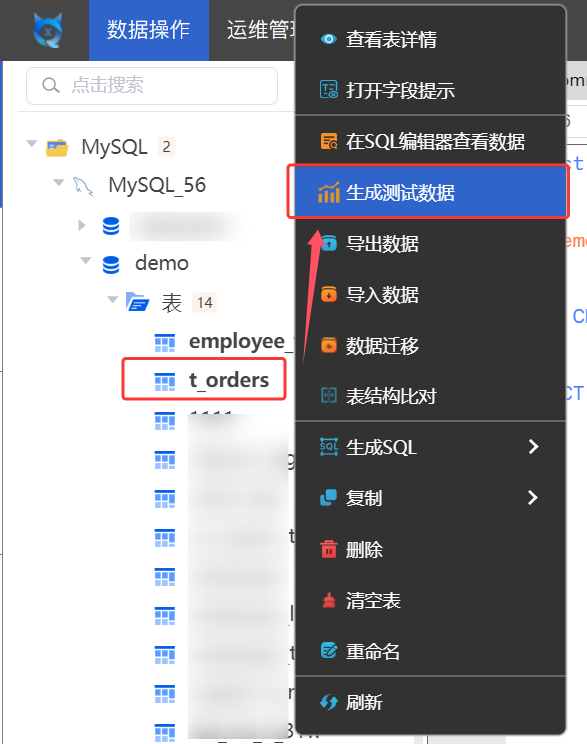 在 SQLynx 中选中表 t_orders,右键选择 "生成测试数据"。
